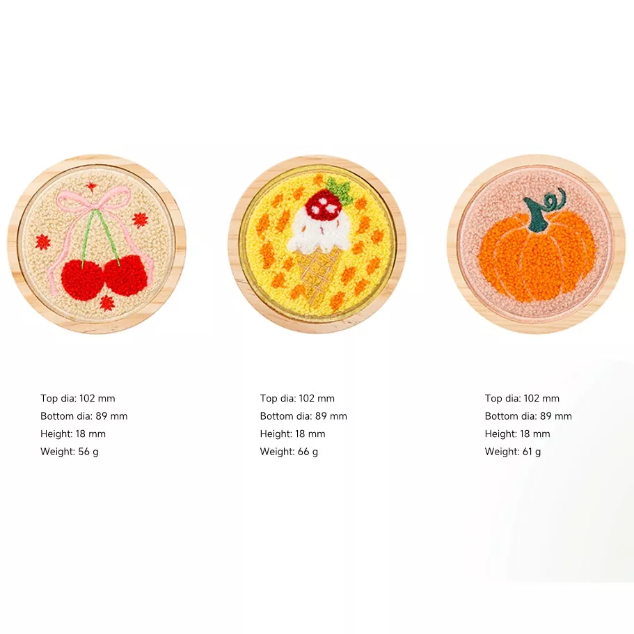 எங்கள் அழகான கையால் செய்யப்பட்ட சூழல் நட்பு மர இமைகள் எம்பிராய்டரி நுட்பத்தைப் பயன்படுத்தி துண்டு துண்டாக வடிவமைக்கப்பட்டுள்ளன. அவை பலவிதமான வடிவமைப்புகளைக் கொண்டுள்ளன, ஒவ்வொன்றும் தெளிவான மற்றும் வாழ்நாள் போன்றவை - நீங்கள் தேர்வுக்காக கெட்டுப்போகிறீர்கள். செர்ரி முறை இளஞ்சிவப்பு மற்றும் சிவப்பு நிறத்தில் துடிப்பானது மற்றும் அபிமானமானது, அதைப் பார்ப்பதன் மூலம் கிட்டத்தட்ட இனிமையானது. ஐஸ்கிரீம் முறை, அதன் துடிப்பான மஞ்சள் மற்றும் வெள்ளை கலவையுடன், சுத்தமாகவும் புத்துணர்ச்சியுடனும் உள்ளது, இது கோடை போன்ற குளிர்ச்சியைக் கொண்டுவருகிறது. பூசணி மூடி ஒரு துடிப்பான ஆரஞ்சு, இலையுதிர்காலத்தின் அரவணைப்பைக் கொண்டுள்ளது. டோனட் மூடியின் துடிப்பான சிவப்பு மற்றும் நீல உச்சரிப்புகள் கலகலப்பாகவும் இனிமையாகவும் இருக்கும். காக்டெய்ல் முறை ஒரு காதல் இளஞ்சிவப்பு, மிகவும் வசீகரிக்கும். எலுமிச்சை முறை, அதன் பிரகாசமான மஞ்சள் மற்றும் பச்சை நிற குறிப்புகளுடன், ஒரு துடிப்பான, புளிப்பு மற்றும் இனிப்பு அதிர்வை வெளிப்படுத்துகிறது.