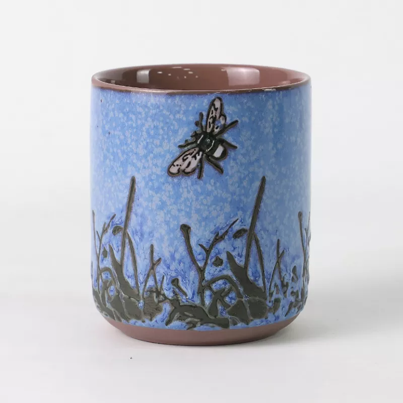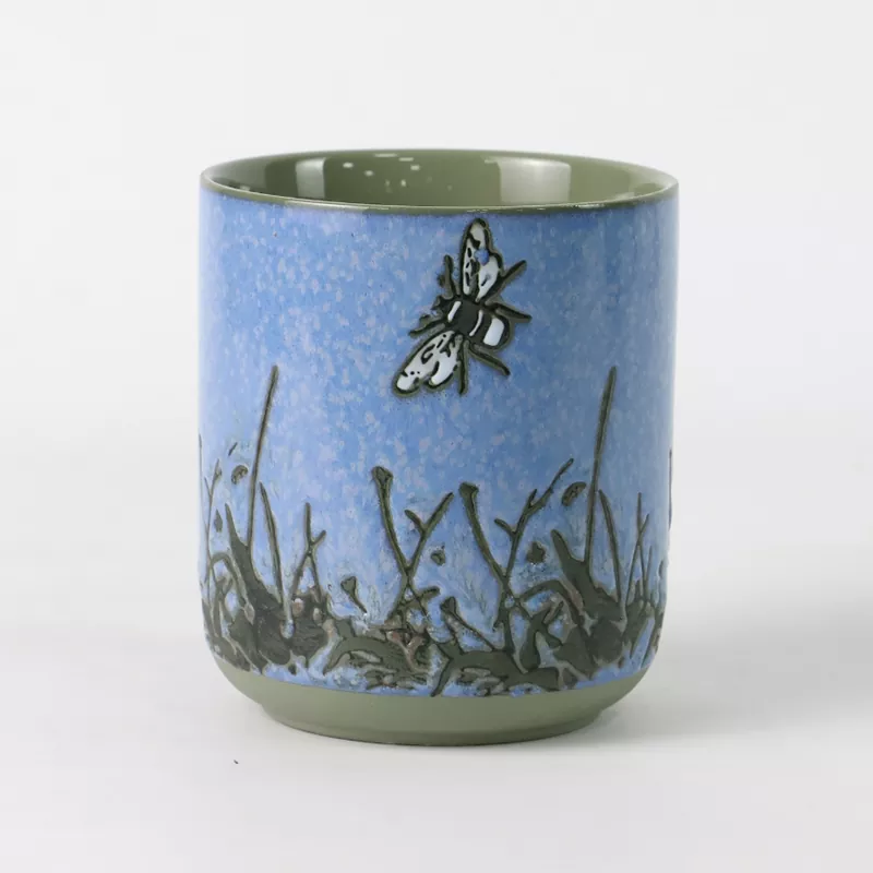 இன்செக்ட் பேட்டர்ன் செராமிக் கேண்டில் ஹோல்டர் தொடர் "கார்டிசெப்ஸ் சிம்பயோசிஸ்" இன் இயற்கையான படங்களிலிருந்து உத்வேகம் பெறுகிறது, இது கிளாசிக்கல் கிழக்கு அழகியலின் சாரத்தையும் நட்சத்திரங்கள் நிறைந்த வானத்தின் மாய அழகையும் படம்பிடிக்கிறது. இது கையால் வரையப்பட்ட அண்டர்கிளேஸ் அலங்காரத்துடன் உயர்-வெப்பநிலை சூளையில் எரியும் படிந்து உறைந்து, டஜன் கணக்கான சரிசெய்தல் மற்றும் மேம்பாடுகளுக்கு உட்பட்டு, இறுதியில் மூன்று சிக்னேச்சர் வண்ணங்களை உருவாக்குகிறது: ஸ்டார்ரி நைட் ப்ளூ, மிஸ்டிக் கிரீன் மற்றும் டீப் இண்டிகோ. கோப்பையின் வெளிப்புறச் சுவர், பால்வீதியின் பிரகாசம் உங்கள் உள்ளங்கையில் இருப்பதைப் போல, சிறந்த தங்கப் புள்ளிகளால் தெளிக்கப்பட்ட ஒரு பெரிய நட்சத்திரங்கள் நிறைந்த வானத்தை ஒத்திருக்கிறது; உட்புறச் சுவர் ஒரு கண்ணாடியைப் போல தெளிவான ஒரு தூய மெருகூட்டலைப் பயன்படுத்துகிறது, வெளியில் உள்ள விண்மீன்கள் நிறைந்த வான அமைப்புடன் ஒரு வலுவான காட்சி மாறுபாட்டை உருவாக்குகிறது, ஒளி மற்றும் நிழலின் இடைவெளியில் புத்தி கூர்மையைக் காட்டுகிறது. கையால் வரையப்பட்ட பட்டாம்பூச்சி, புல் தண்டு மற்றும் கீழே உள்ள டேன்டேலியன் வடிவங்கள், அனுபவம் வாய்ந்த கைவினைஞர்களால் உன்னிப்பாக வடிவமைக்கப்பட்டுள்ளன, அவை உயிரோட்டமாகவும் துடிப்பாகவும் உள்ளன, இது வாழ்க்கையின் சுழற்சி மற்றும் இயற்கையின் கூட்டுவாழ்வின் நித்திய கதையைச் சொல்கிறது. ஒவ்வொரு கோப்பையும் ஒரு தனித்துவமான கலைப் படைப்பாகும், இது இயற்கையின் மீது மரியாதை மற்றும் வாழ்க்கையின் கொண்டாட்டத்தை உள்ளடக்கியது.
